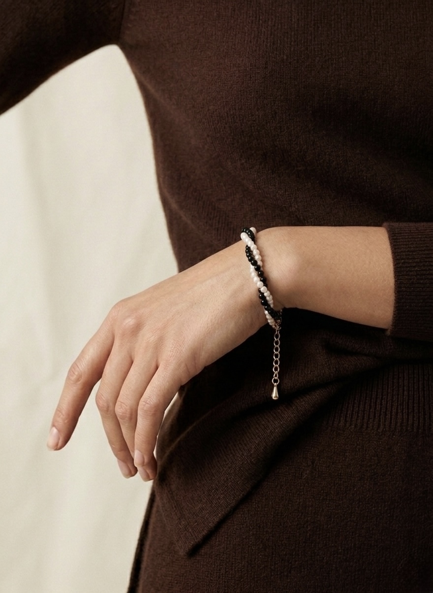 Realizată din perle naturale de cultură 3 mm îmbrățișate de de pietre semiprețioase, turmalină sfere de 3 mm., fiecare brățară poartă o poveste discretă și elegantă. Înșirate manual pe un șnur fin și rezistent, oferă confort și grație la fiecare purtare. Bijuteria dispune de o extensie de 3,5 cm pentru o ajustare perfectă.