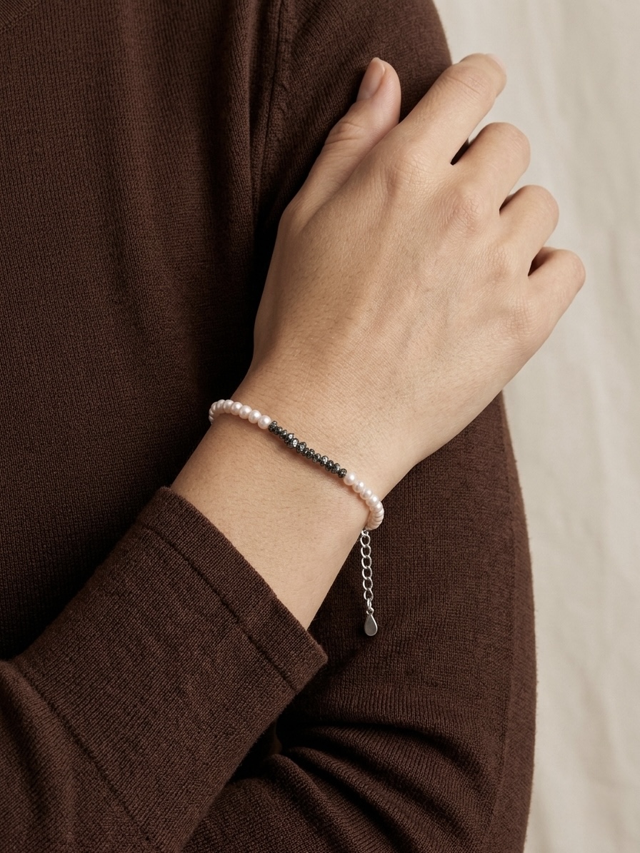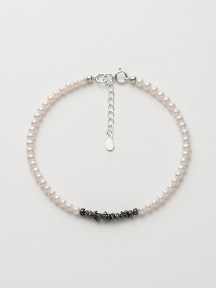 Realizată din perle naturale de cultură 3 mm, având în centrul atenției diamante brute – pietre veritabile, neșlefuite, care își păstrează energia pură fiecare brățară poartă o poveste discretă și elegantă. Înșirate manual pe un șnur fin și rezistent, oferă confort și grație la fiecare purtare. Bijuteria dispune de o extensie de 3,5 cm pentru o ajustare perfectă.
