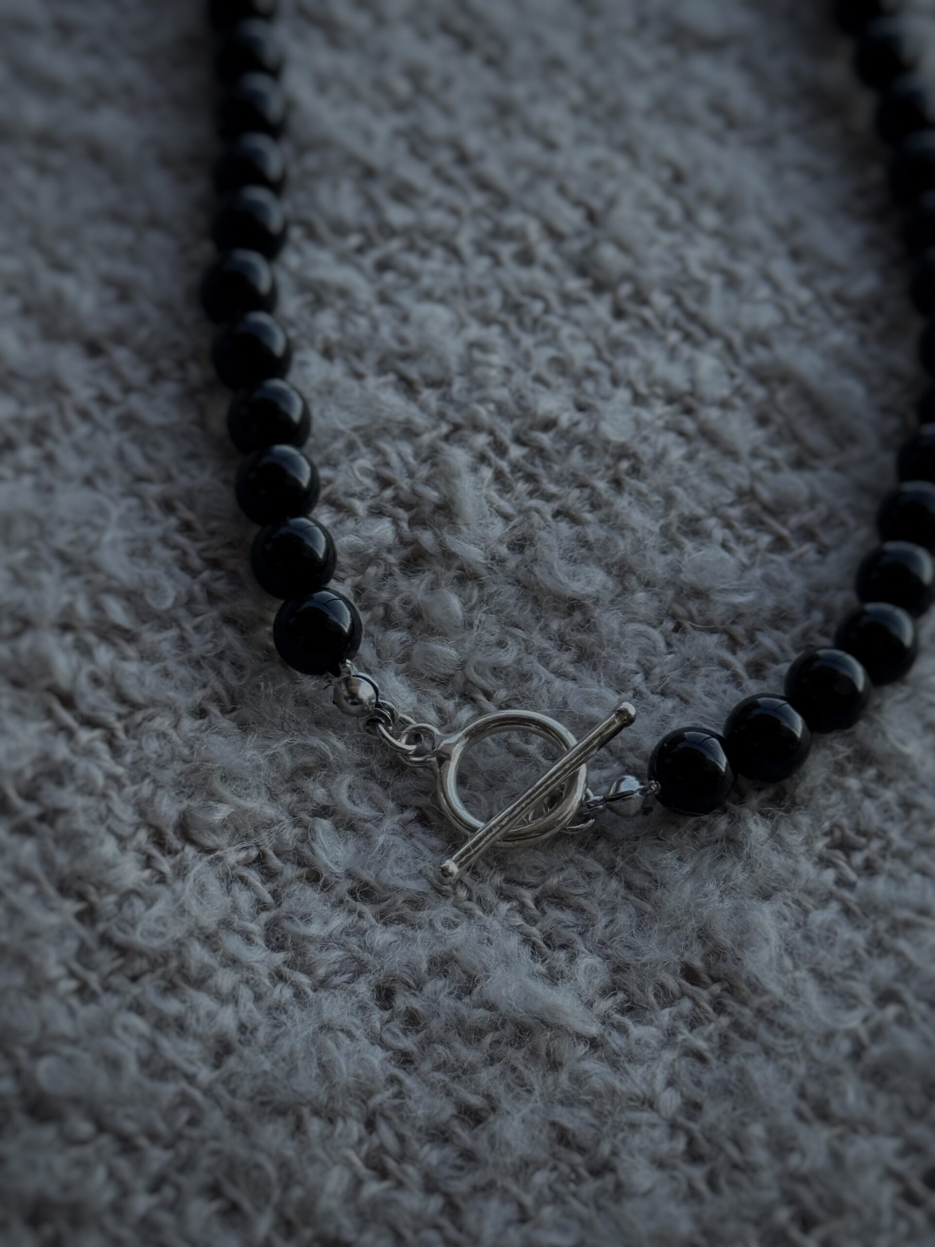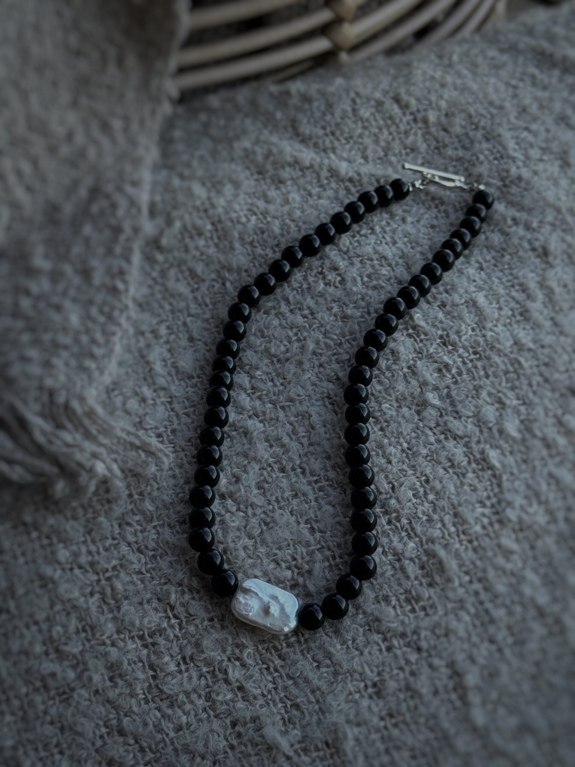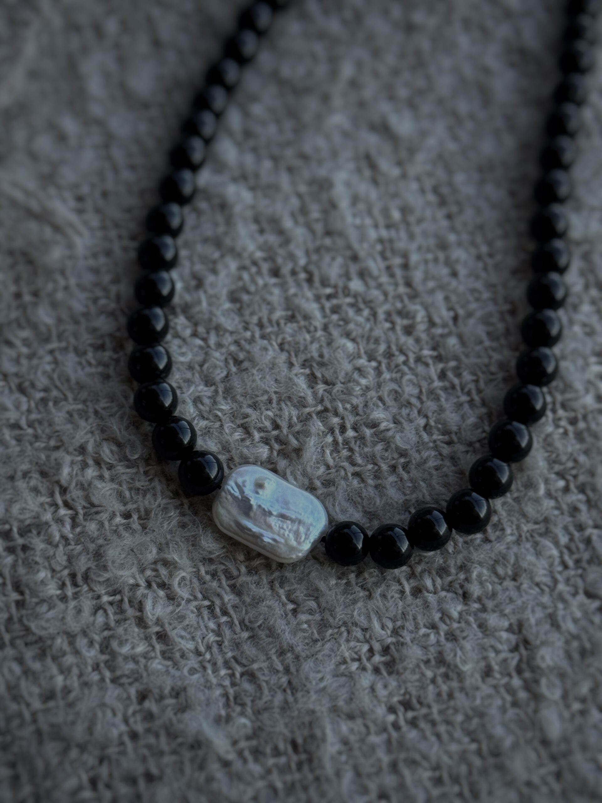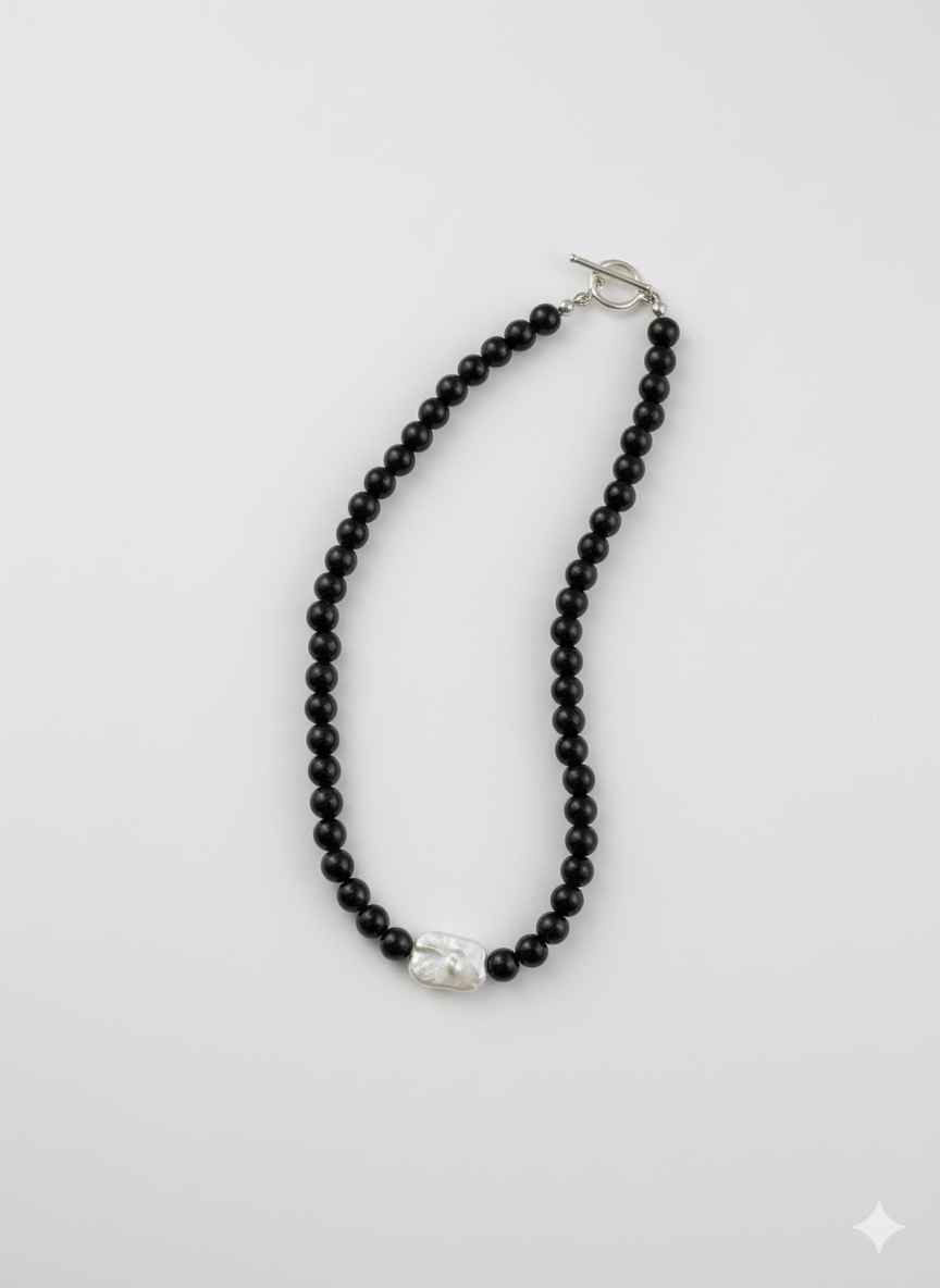 Realizat din onix și o perlă naturală de cultură baroc, fiecare colier prinde forma unei povești diferite. Înșirate manual pe un șnur fin și rezistent, oferă confort și grație la fiecare purtare.
