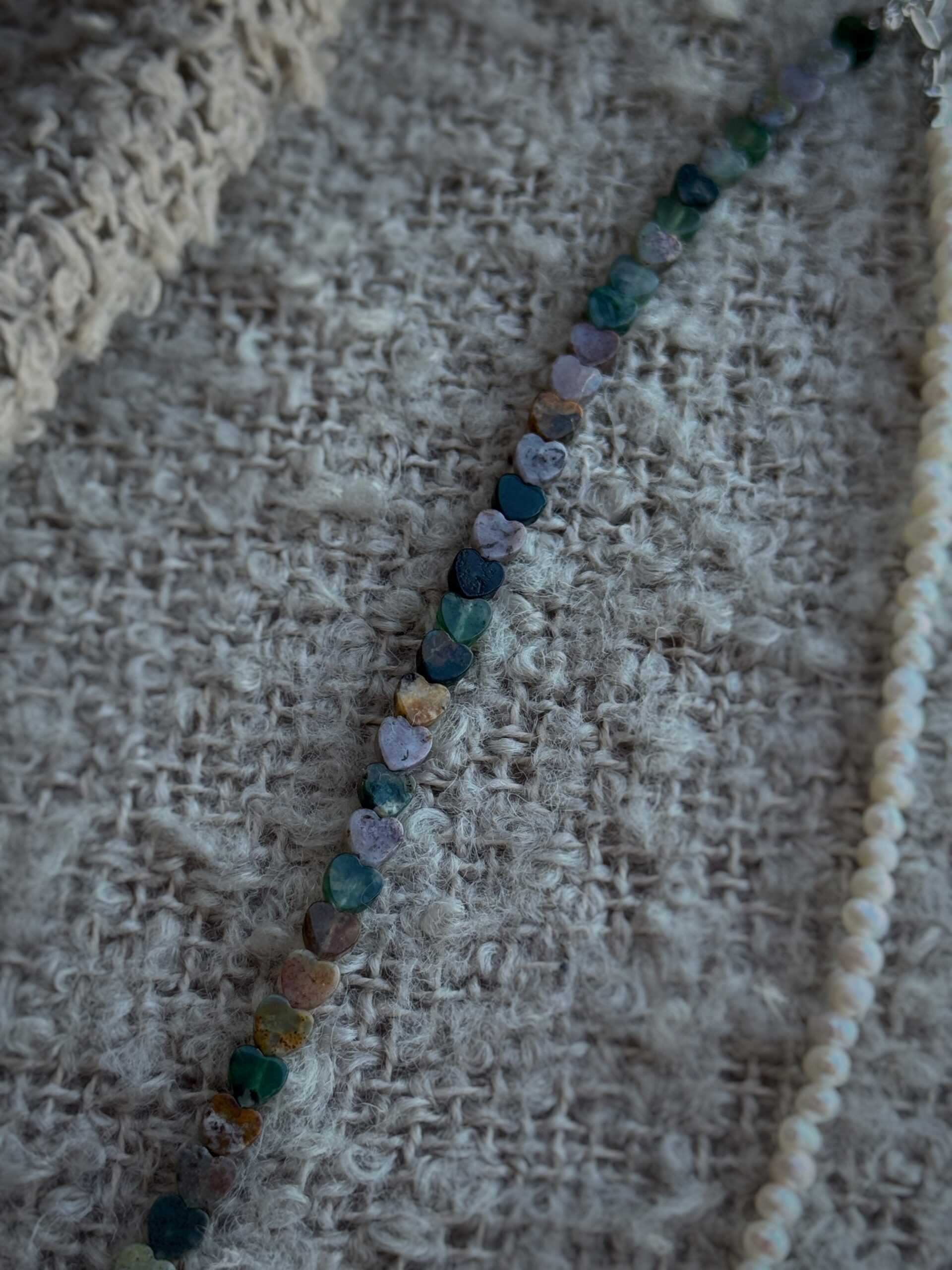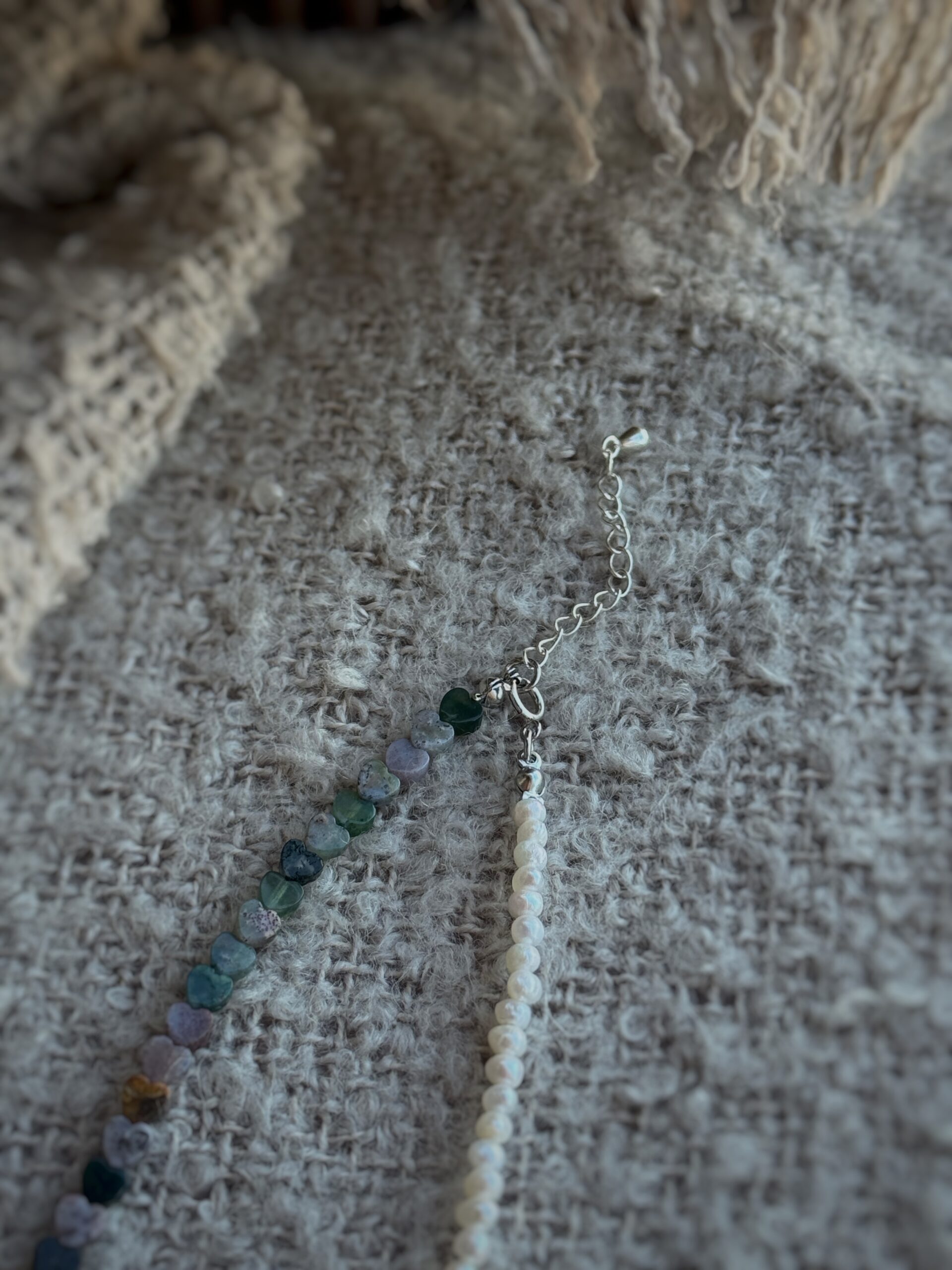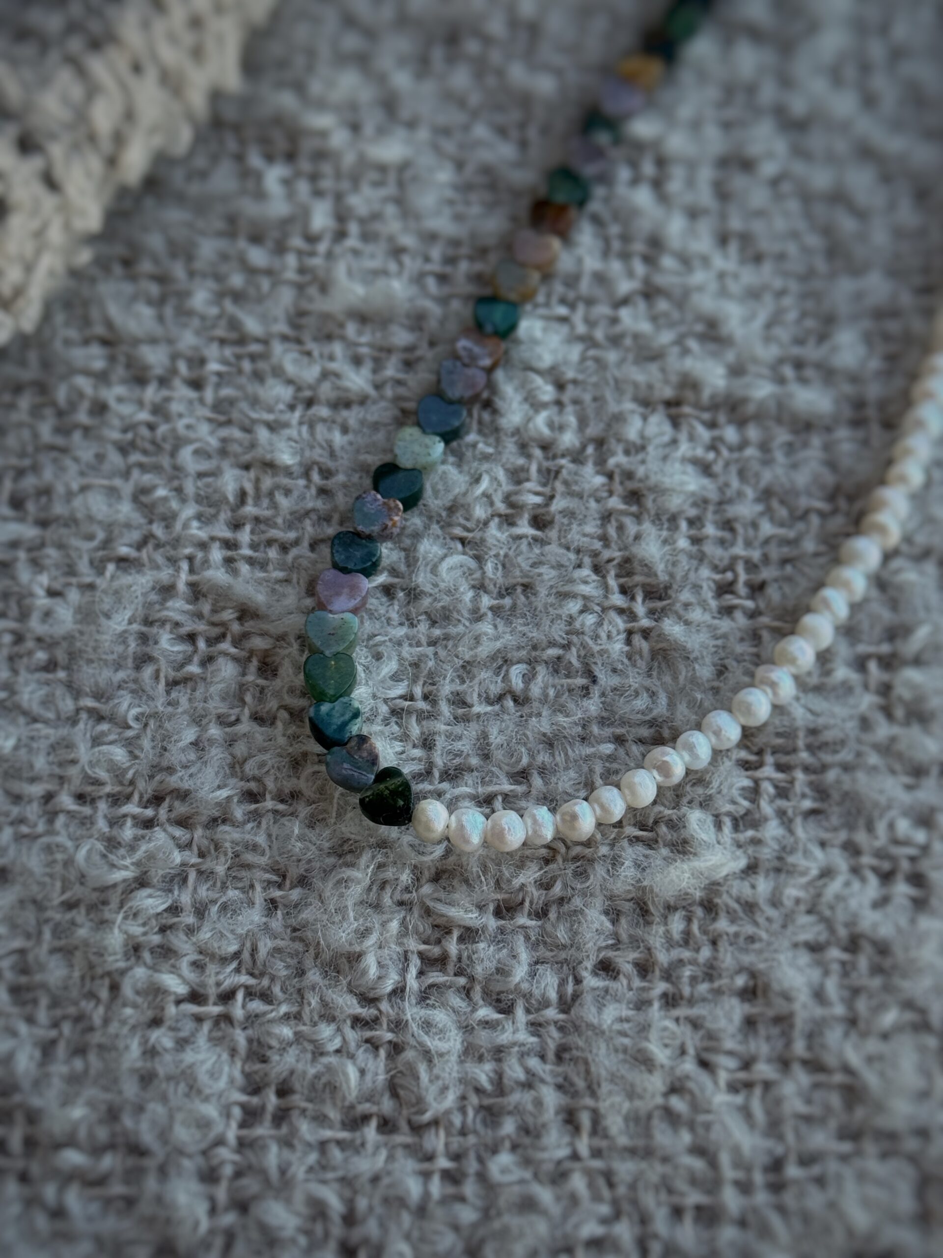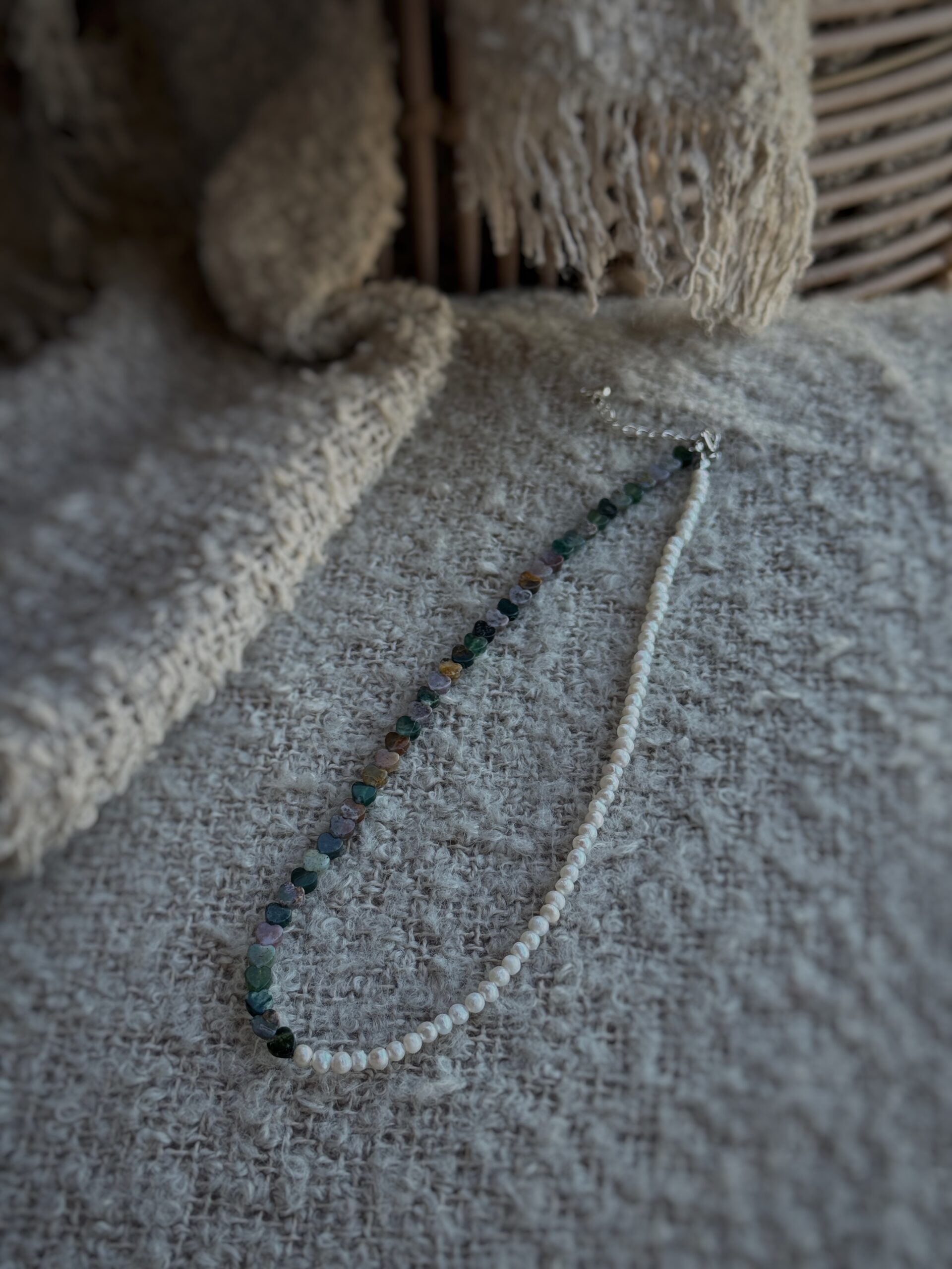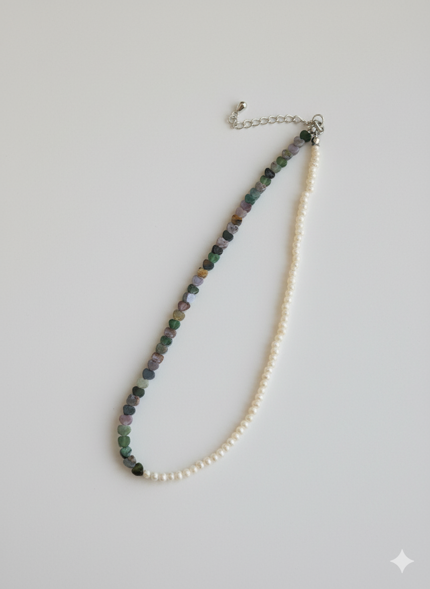 Realizat din perle naturale de cultură și agat indian, fiecare colier prinde forma unei povești diferite. Înșirate manual pe un șnur fin și rezistent, perlele oferă confort și grație la fiecare purtare.