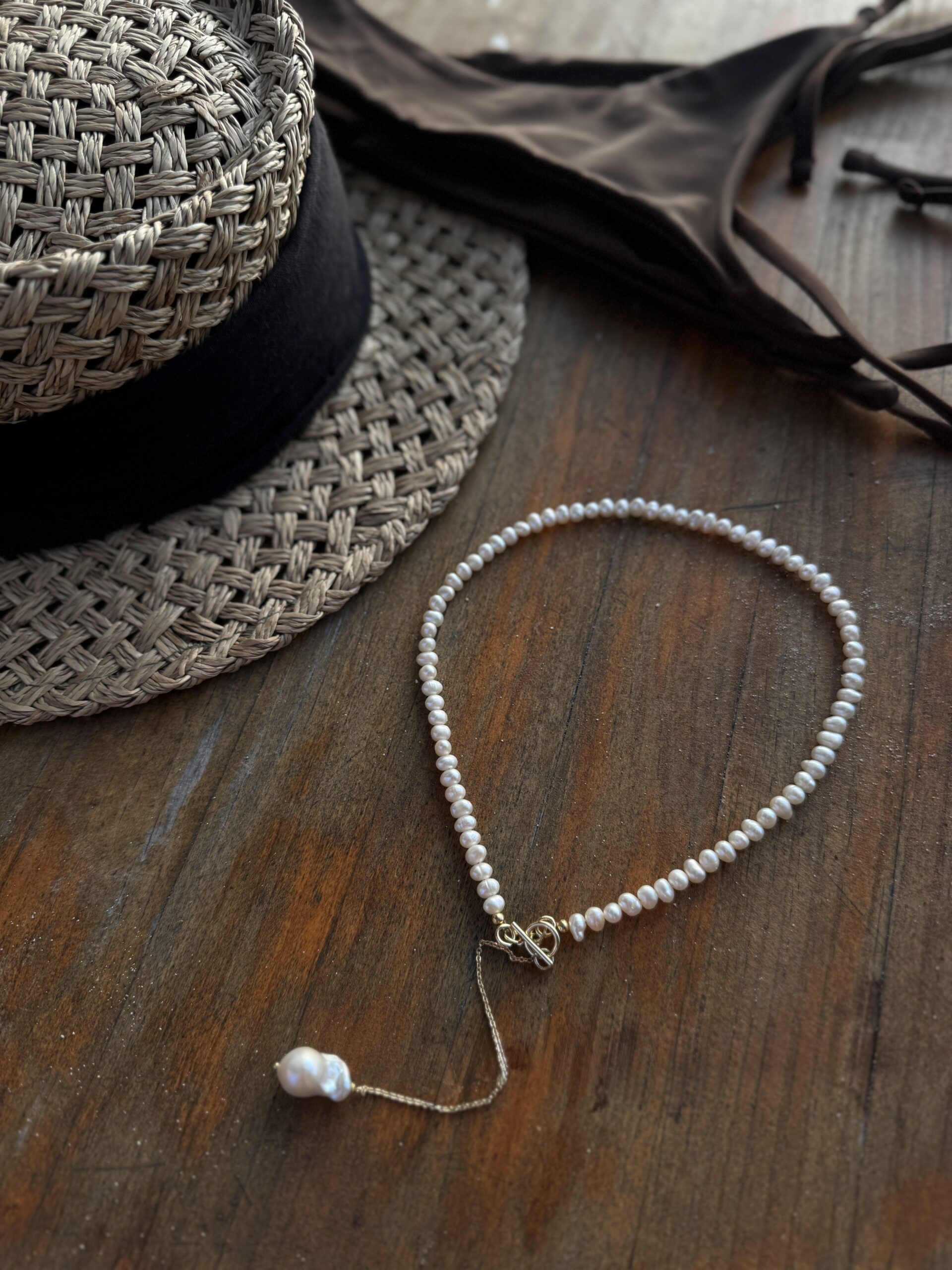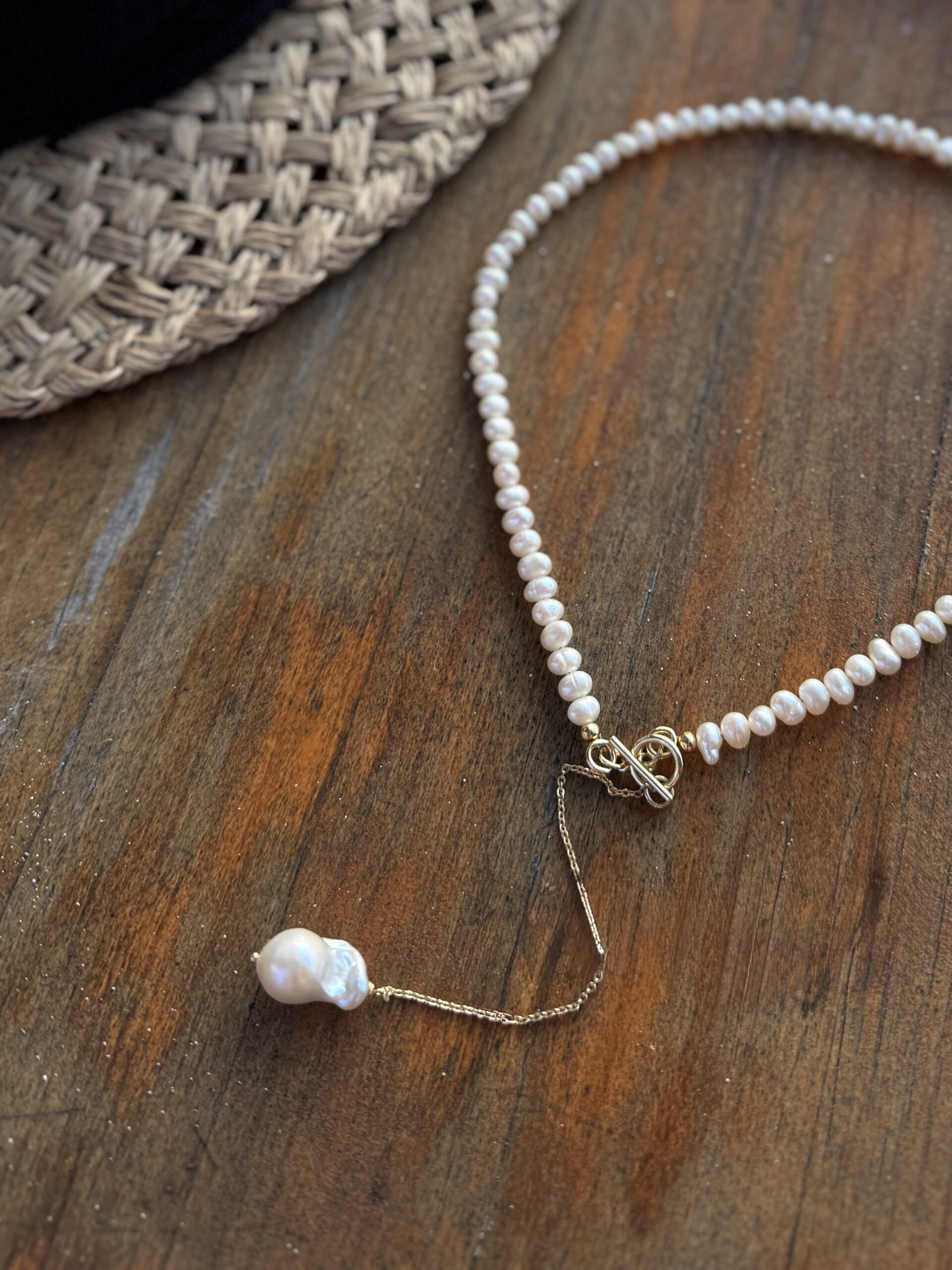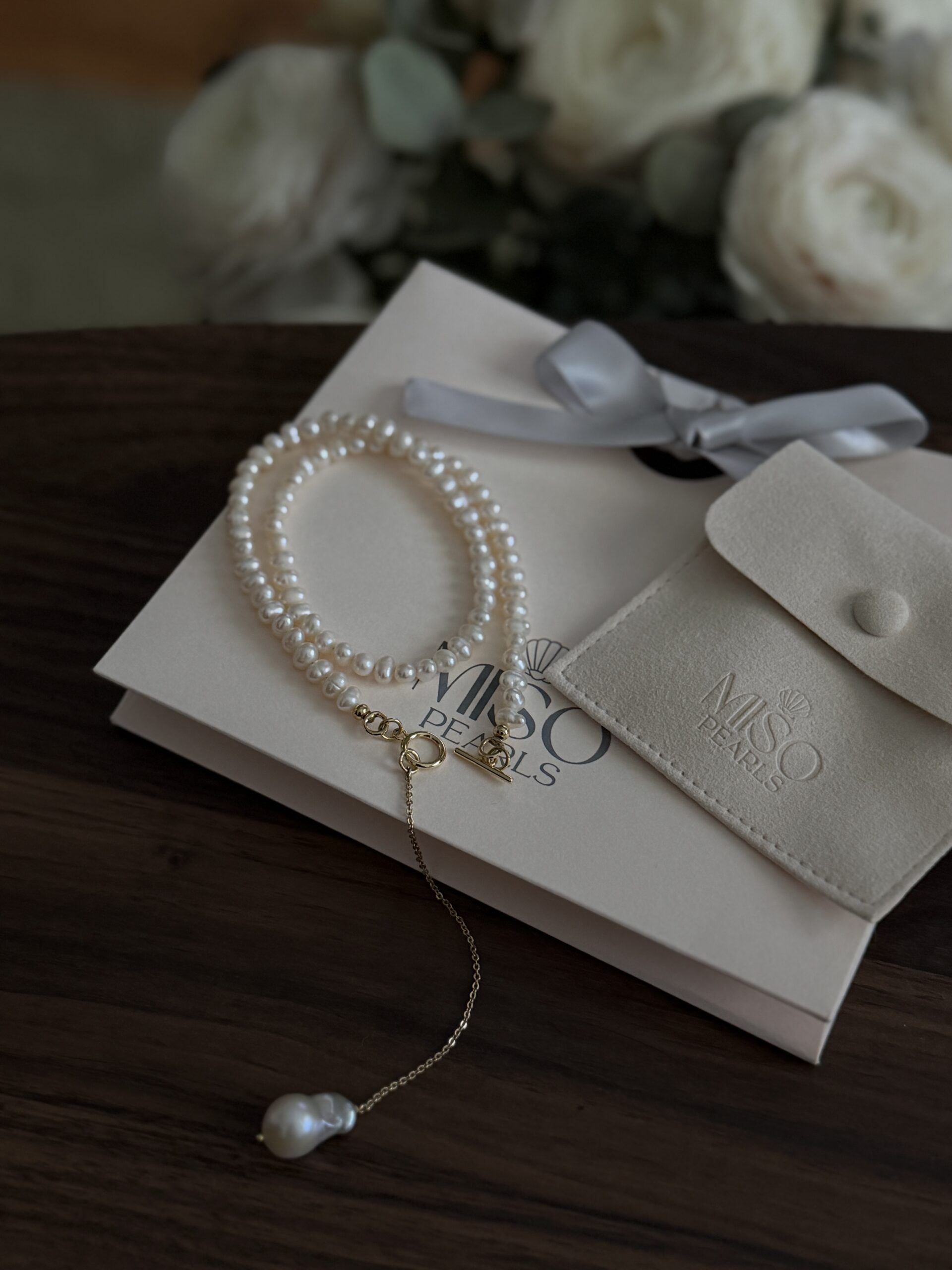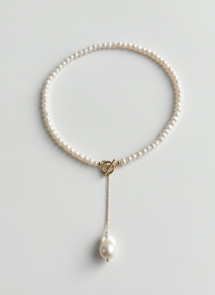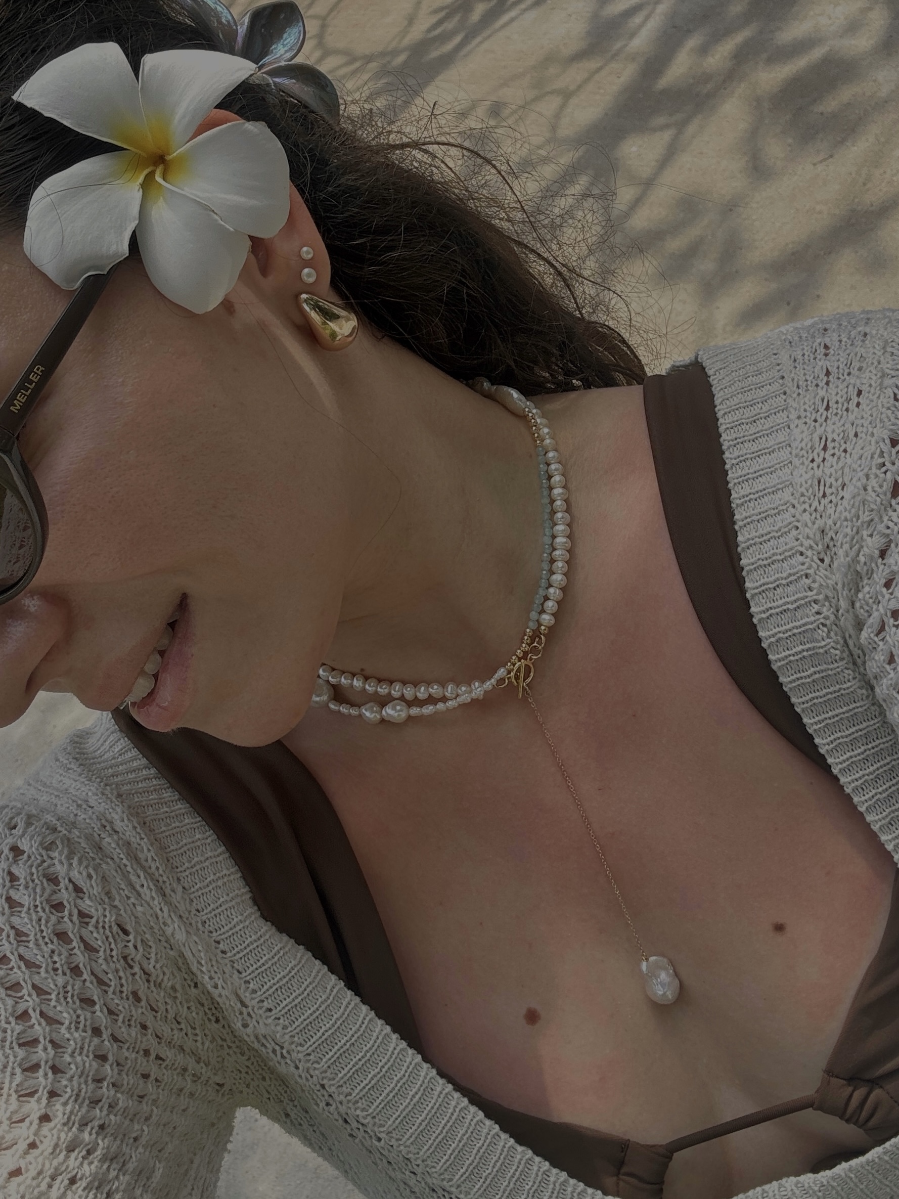 Realizat din perle naturale de cultură, fiecare colier prinde forma unei povești diferite. Înșirate manual pe un șnur fin și rezistent, perlele oferă confort și grație la fiecare purtare. Cu o prelungire subtilă și fină a unei perle baroc neregulată, colierul aduce un plus de senzualitate.